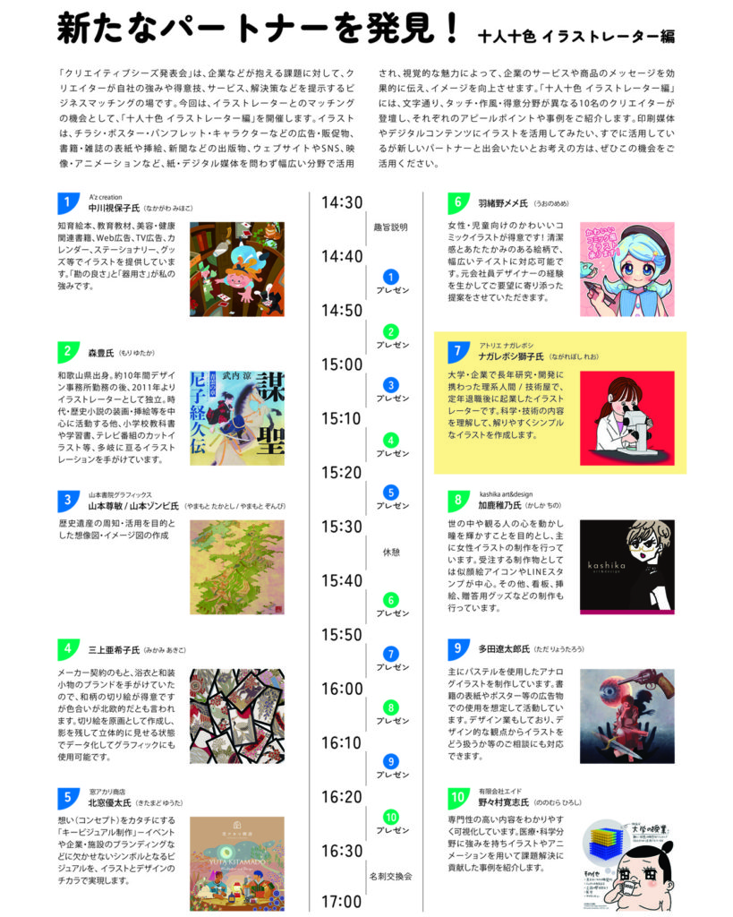 「クリエイティブシーズ発表会」は、企業などが抱える課題に対して、クリエイターが自社の強みや得意技、サービス、解決策などを提示するビジネスマッチングの場です。今回は、イラストレーターとのマッチングの機会として、「十人十色 イラストレーター編」を開催します。