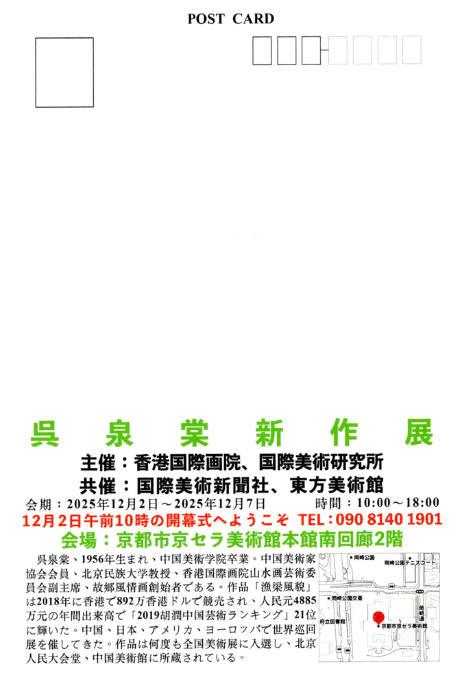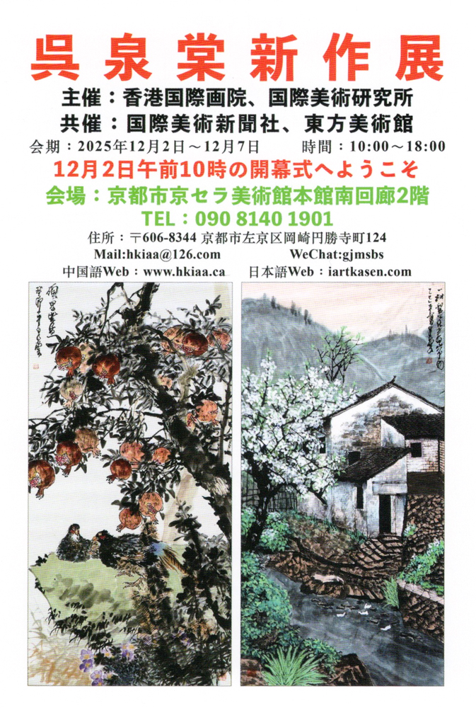 呉泉棠さんの水墨画約80点に加え、協賛展示として日中両国の作家の絵画や書等の展示約30点もありますので、お近くにお越しの際はお立ち寄りいただけると幸いです。